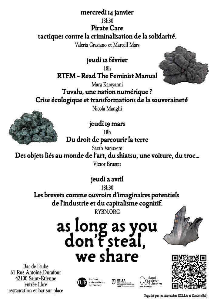 Du 14 janvier au 02 avril, les journées "As long as you don't steal we share" proposeront des workshops, des conférences, des éditions, des performances et des projections.